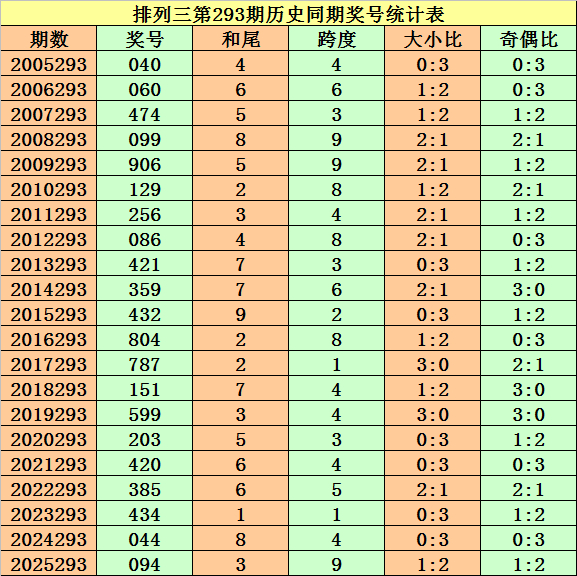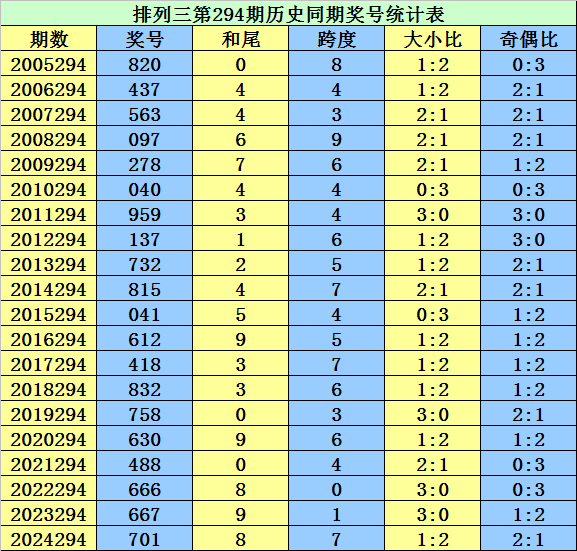 积年第293期陈列三同时奖号开出:040、060、474、099、906、129、256、086、421、359、432、804、787、151、599、203、420、385、434、044、094。 积年第294期陈列三同时奖号开出:820、437、563、097、278、040、959、137、732、815、041、612、418、832、758、630、488、666、667、701。 从2004年于今陈列三已开出7417期奖号了,本期为陈列三2025年第294期开奖,历史同时已出现20次奖号: