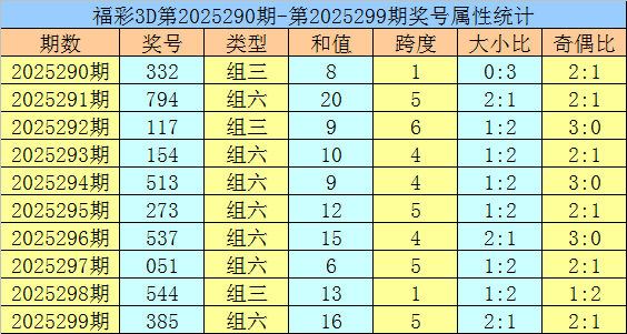 开奖追思:福彩3D第2025299期开出奖号385。奖号形式为组六,奇偶比为2:1山东路通通讯服务有限公司,012路比为1:0:2,大小比为2:1,和值为16,跨度为5。