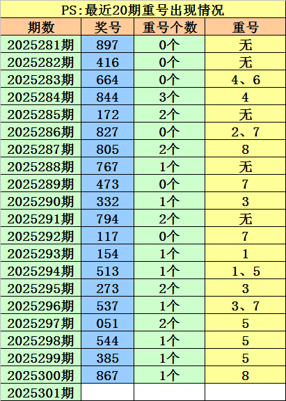 最近100期开奖中,含有重号的奖号有57期,最近20期含有重号的奖号有15期,最近10期含有重号的奖号有9期。本期防卫重号落号。